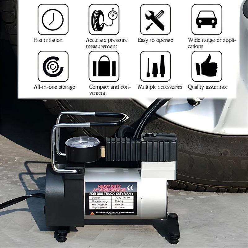 Compresseur d’air Heavy Duty 12V idéal pour gonfler rapidement les pneus de voiture, moto, vélo, ainsi que les ballons et matelas gonflables. Compact, puissant et facile à transporter, il se branche directement sur l’allume-cigare de votre voiture. Son manomètre intégré permet de contrôler la pression en temps réel pour un gonflage précis et sécurisé.