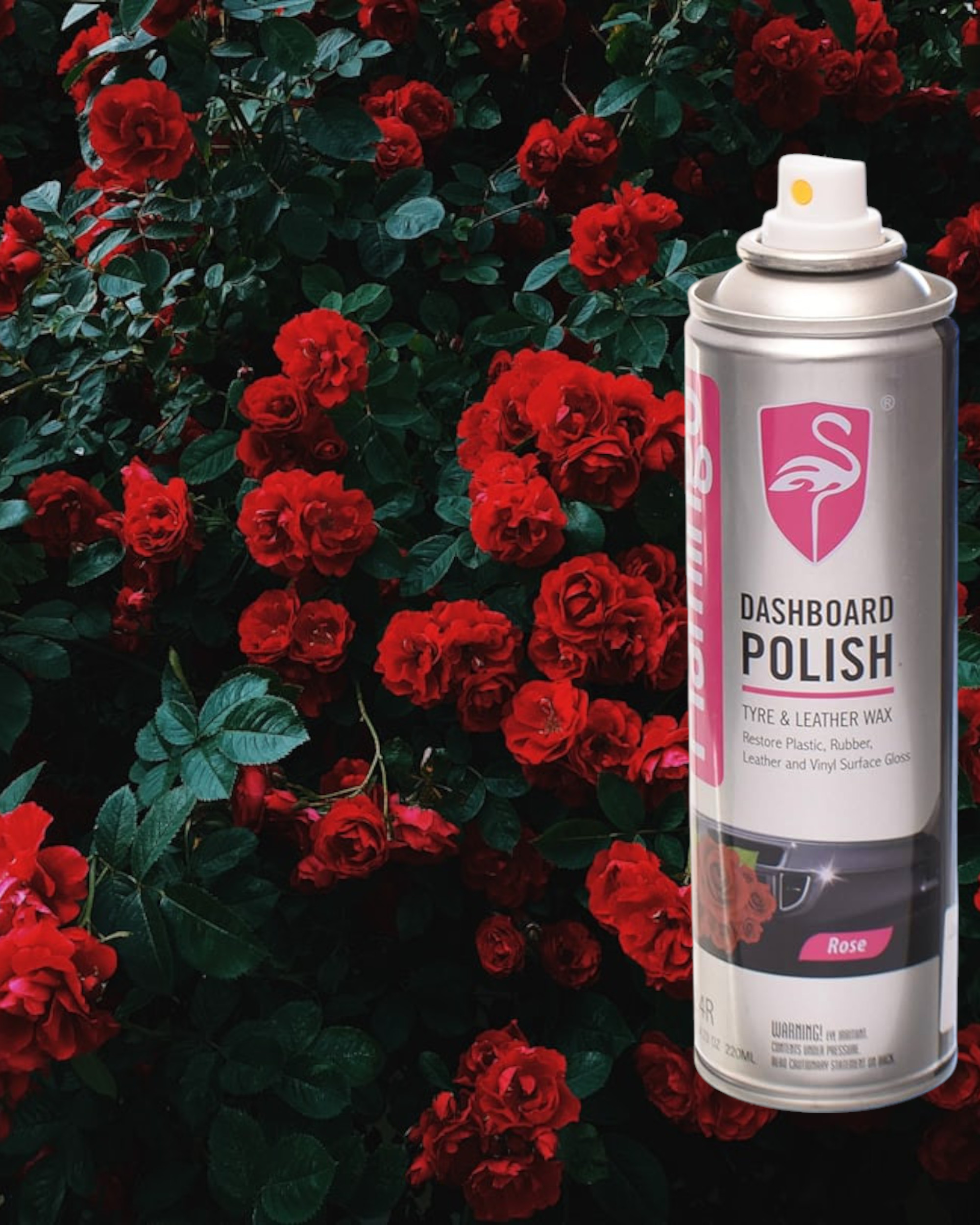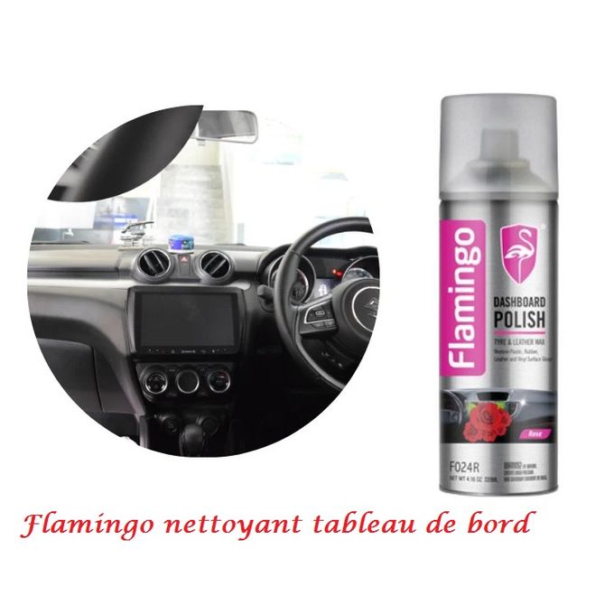 Le Flamingo Dashboard Polish parfum Rose est un spray de cire multi-surfaces conçu pour nettoyer, protéger et faire briller le tableau de bord, les pneus et les surfaces en cuir. Il redonne éclat et souplesse aux plastiques, caoutchoucs, vinyles et cuirs tout en laissant un parfum agréable.