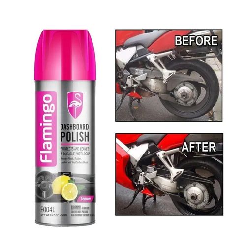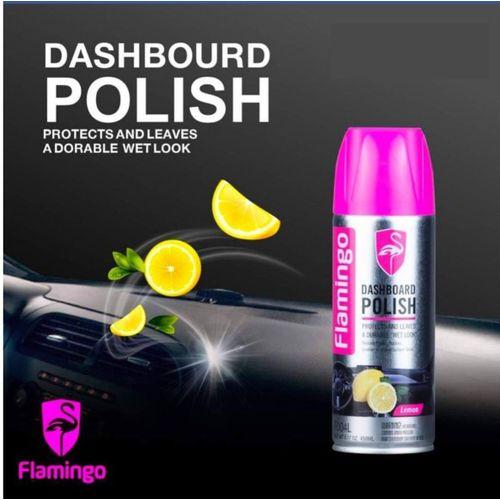 Le Flamingo Dashboard Polish parfum Citron est un spray de cire multi-surfaces conçu pour nettoyer, protéger et faire briller le tableau de bord, les pneus et les surfaces en cuir. Il redonne éclat et souplesse aux plastiques, caoutchoucs, vinyles et cuirs tout en laissant un parfum agréable.