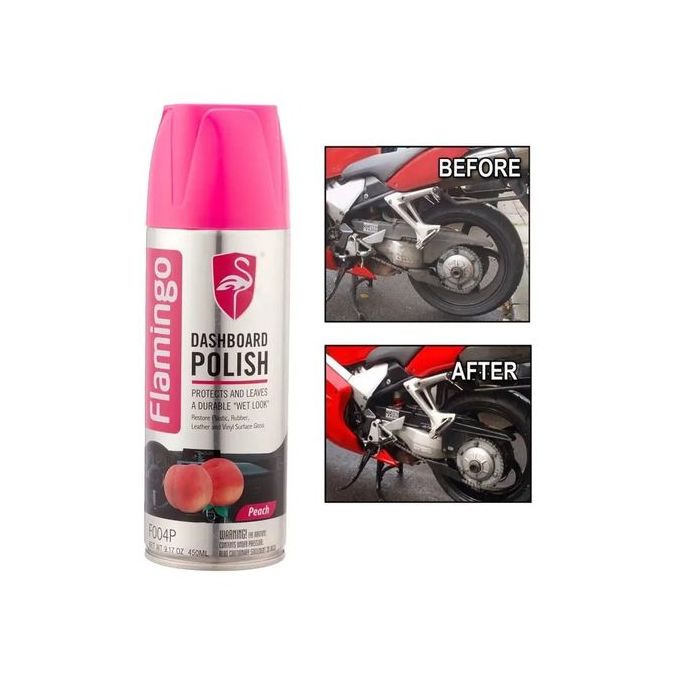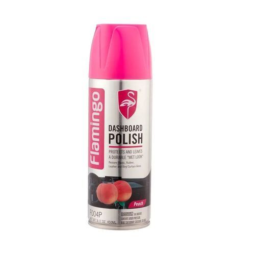 Le Flamingo Dashboard Polish parfum Pêche est un spray de cire multi-surfaces conçu pour nettoyer, protéger et faire briller le tableau de bord, les pneus et les surfaces en cuir. Il redonne éclat et souplesse aux plastiques, caoutchoucs, vinyles et cuirs tout en laissant un parfum agréable.